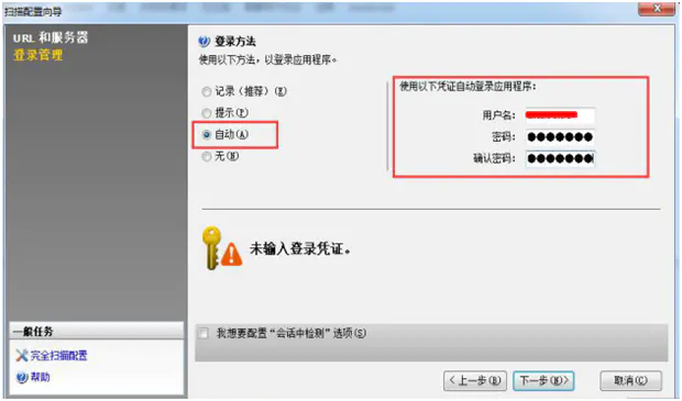 5.登录方法:根据实际需要选择(如:自动),用户名和密码即为被测网站的登录账户,点击“下一步”