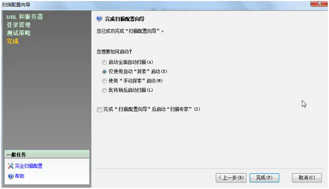 7.设置启动模式,根据实际需要选择(如:仅使用自动“探索”启动),点击“完成”,即可开始启动扫描or测试