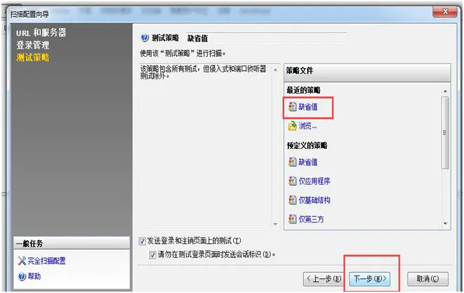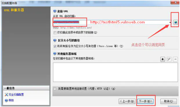 4.进入扫描配置向导页面,URL输入框的地址即为被测网址or其IP地址,如输入以下被测url,点击“下一步”
