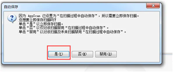 PS:扫描过程中,若扫描时间较长,可自动让其扫描,或者点击“暂停”-保存本次扫描,然后下次继续未扫描的过程;若直接点击右上角“×”关闭AppScan,则不会保存本次扫描的过程