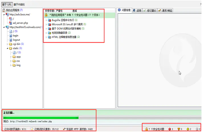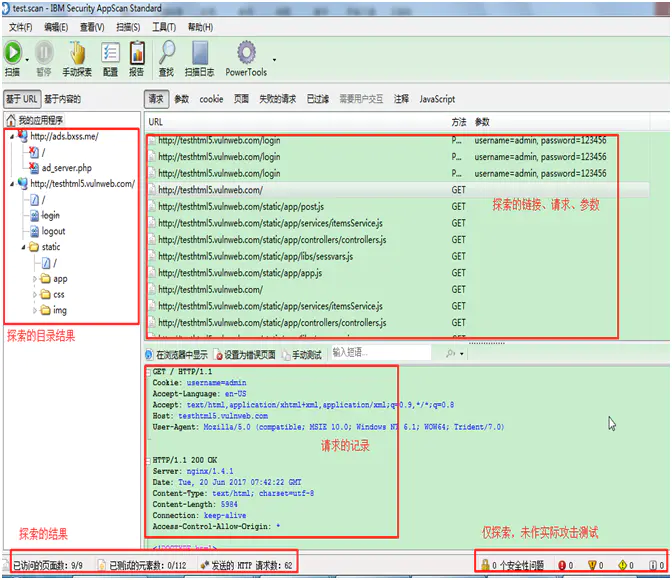 2)AppScan本身有一个内置的漏洞扫描的规则库,可随版本进行更新。从探索出的url中,修改参数or目录名等方式,构造不同的url对照组向服务器发送请求or攻击