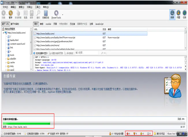 PS:1)可以打开AppScan内置浏览器查看被测链接是否能正常访问;2)以下被测网址为某个专门测试用的漏洞网站,非常规使用的网站