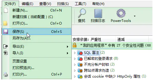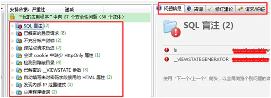 12.测试完成之后,保存本次AppScan扫描测试的结果;从统计出的安全性问题,可以查看对应的漏洞链接、请求和响应、修复建议