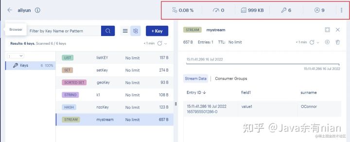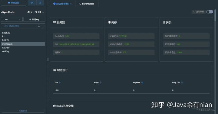 支持 Stream 数据类型的查看,同时也能查看 Redis 服务的基本情况,
