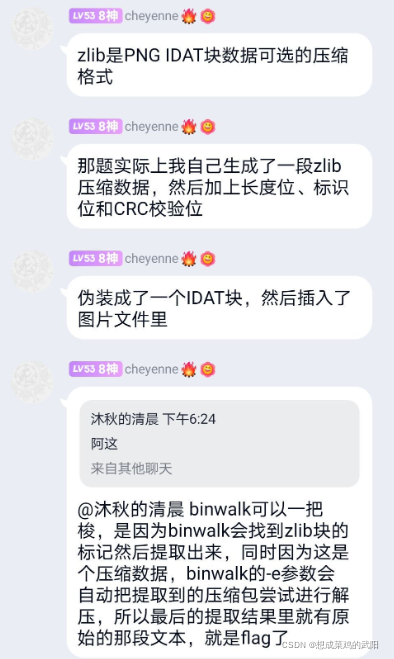 图像数据块IDAT(image data chunk):它存储实际的数据,在数据流中可包含多个连续顺序的图像数据块。binwalk看到的zlib就是其压缩格式 binwalk -e可以实现自动解压
