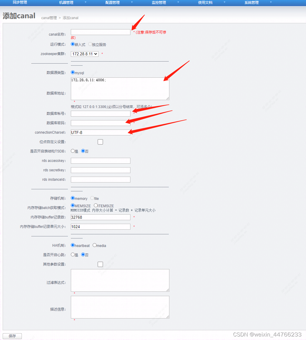 canal名称必填,数据库地址,账号密码必填,其余可以用默认值
