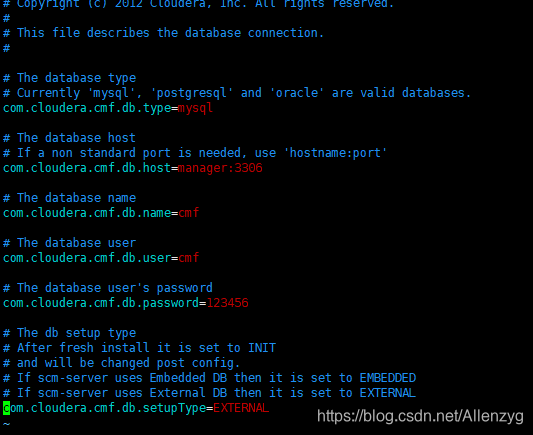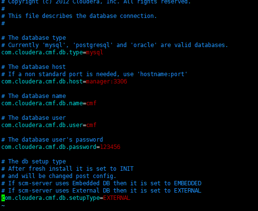注意:com.cloudera.cmf.db.setupType一定要改成EXTERNAL,这是一个坑。