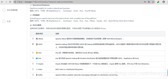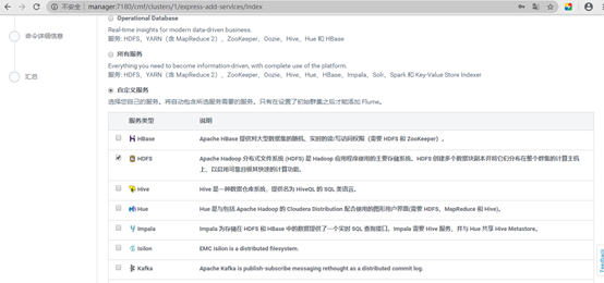 点击继续,选择要安装的服务,自定义服务:自己决定安装什么,比如安装:HDFS,勾选上就行