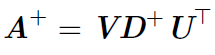 其中,矩阵U,D 和V 是矩阵A奇异值分解后得到的矩阵。对角矩阵D 的伪逆D+ 是其非零元素取倒之后再转置得到的。