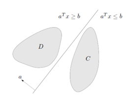 所谓两个凸集分离,直观地看是指两个凸集合没有交叉和重合的部分,因此可以用一张超平面将两者隔在两边,如下图所示: