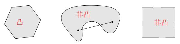实数域R上(或复数C上)的向量空间中,如果集合S中任两点的连线上的点都在S内,则称集合S为凸集,如下图所示: