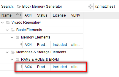 2、搜索”Block Memory Generator“双击选择RAMs & ROMs & BRAM下的IP核