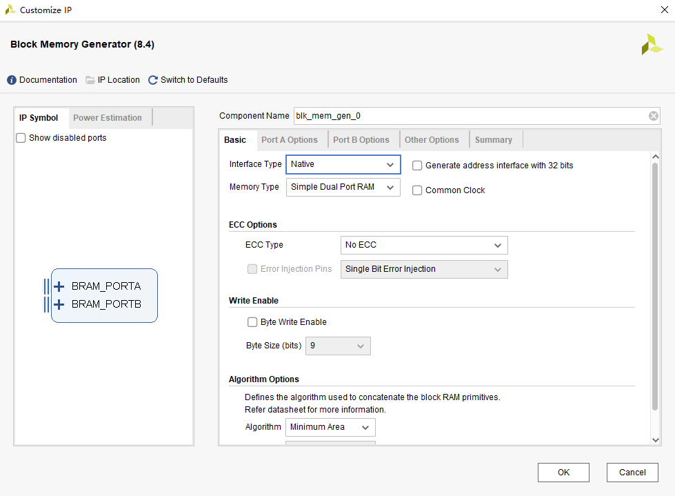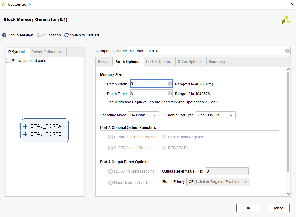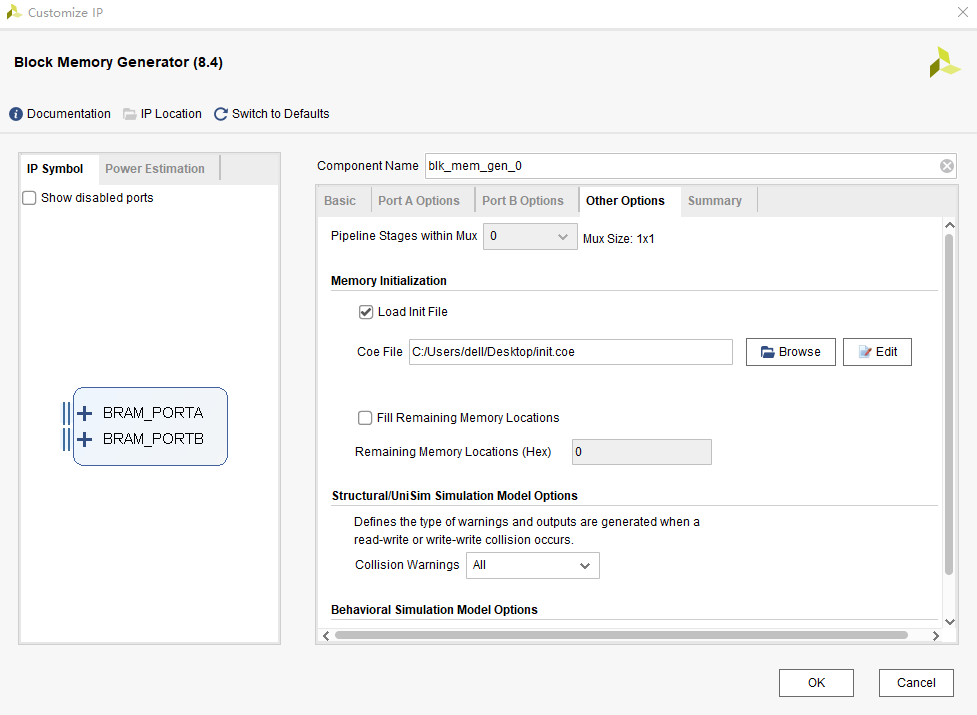 3、配置IP核为Simple Dual Port RAM,Width为8,Depth为9,load数据文件init.coe,点击OK