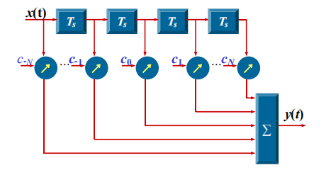 借助横向滤波器实现均衡是可能的,并且只要用无限长的横向滤波器,就能做到消除码间串扰的影响。然而,使横向滤波器的抽头无限多是不现实的,大多情况下也是不必要的。因为实际信道往往仅是一个码元脉冲波形对邻近的少数几个码元产生串扰,故实际上只要有一、二十个抽头的滤波器就可以了。抽头数太多会给制造和使用都带来困难。