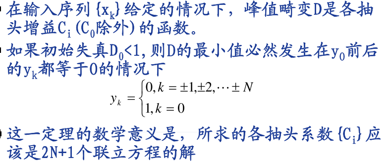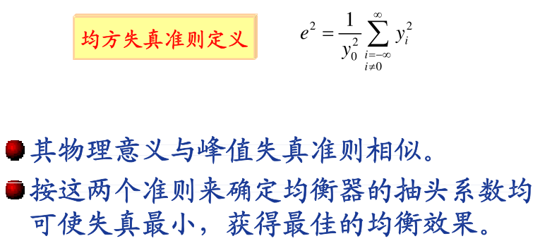 然而在抽头数有限情况下,均衡器的输出将有剩余失真,为了反映这些失真的大小,(也可以说是如何调整抽头系数以获得最佳的均衡效果,使失真达到最小?)一般采用峰值失真准则和均方失真准则作为衡量标准。