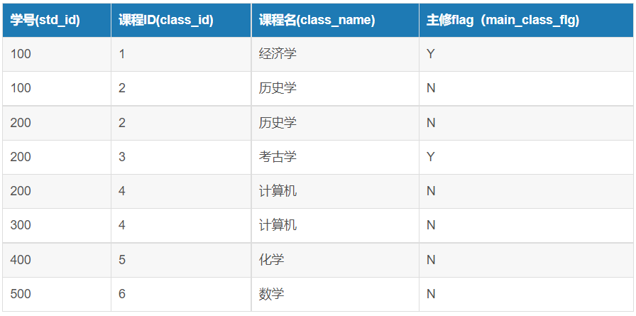 - 有的学生选择了同时修几门课程(100,200)也有的学生只选择了一门课程(300,400,500)。选修多门课程的学生,要选择一门课程作为主修,主修flag里面写入 Y。只选择一门课程的学生,主修flag为N(实际上要是写入Y的话,就没有下面的麻烦事了,为了举例子,还请多多包含)。