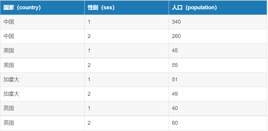 SELECT country,SUM( CASE WHEN sex = '1' THEN population ELSE 0 END), --男性人口SUM( CASE WHEN sex = '2' THEN population ELSE 0 END) --女性人口FROM Table_A GROUP BY country;