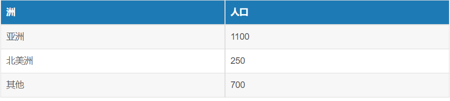 SELECT SUM(population),CASE countryWHEN '中国' THEN '亚洲'WHEN '印度' THEN '亚洲'WHEN '日本' THEN '亚洲'WHEN '美国' THEN '北美洲'WHEN '加拿大' THEN '北美洲'WHEN '墨西哥' THEN '北美洲' ELSE '其他' END