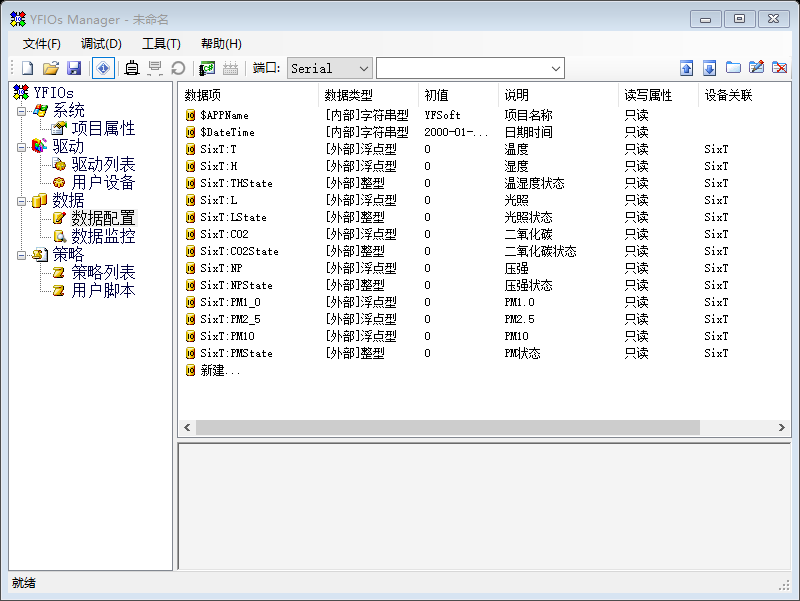 用户驱动配置好后,我们单击“数据配置”可以看到对应的传感器属性都已经自动配置出来了(如下图)。