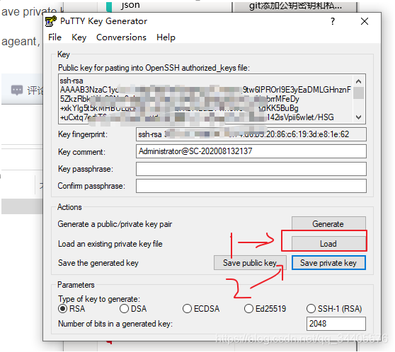6.选择load那个id_rsa文件(在第二步默认生成的ssh key的位置,在系统用户文件夹中,可以在系统磁盘中搜索id_rsa)