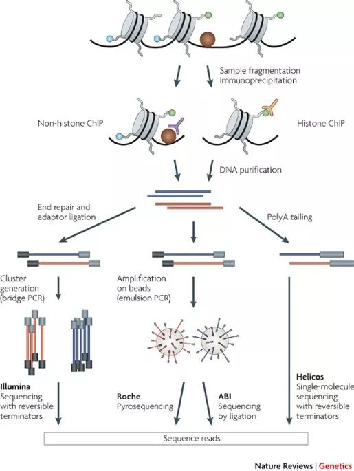 染色质免疫共沉定技术,可以研究生物体内DNA与蛋白质的相互作用,首先在活细胞内固定DNA与蛋白结合的复合体,然后用蛋白特异性的抗体,通过抗原抗体特异性结合的免疫学手段捕获该复合体,然后洗脱蛋白质,得到与目的蛋白结合的DNA片段,将富集到的DNA片段进行上机测序,即形成了一套成熟的分析流程,称之为chip-seq, 就是将传统的chip技术和高通量测序结合起来,对应的英文如下