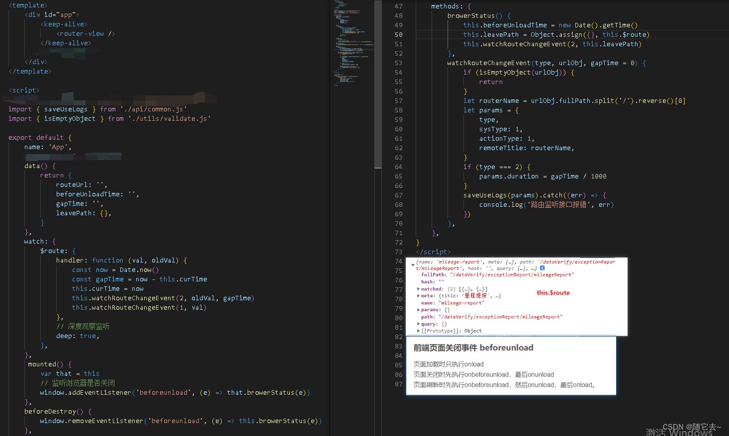 export default {name: 'App',data() {return {routeUrl: '',beforeUnloadTime: '',gapTime: '',leavePath: {},}},watch: {$route: {handler: function (val, oldVal) {const now = Date.now()const gapTime = now - this.curTimethis.curTime = nowthis.watchRouteChangeEvent(2, oldVal, gapTime)this.watchRouteChangeEvent(1, val)},// 深度观察监听deep: true,},},mounted() {var that = this// 监听浏览器是否关闭window.addEventListener('beforeunload', (e) => that.browerStatus(e))},beforeDestroy() {window.removeEventListener('beforeunload', (e) => this.browerStatus(e))},methods: {browerStatus() {this.beforeUnloadTime = new Date().getTime()this.leavePath = Object.assign({}, this.$route)this.watchRouteChangeEvent(2, this.leavePath)},watchRouteChangeEvent(type, urlObj, gapTime = 0) {if (isEmptyObject(urlObj)) {return}let routerName = urlObj.fullPath.split('/').reverse()[0]let params = {type,sysType: 1,actionType: 1,remoteTitle: routerName,}if (type === 2) {params.duration = gapTime / 1000}saveUseLogs(params).catch((err) => {console.log('路由监听接口报错', err)})},},