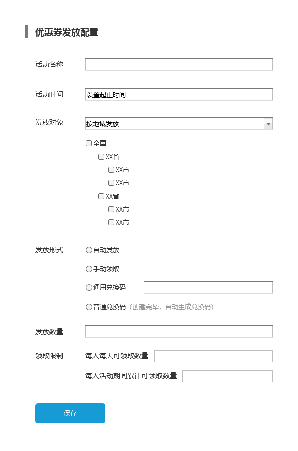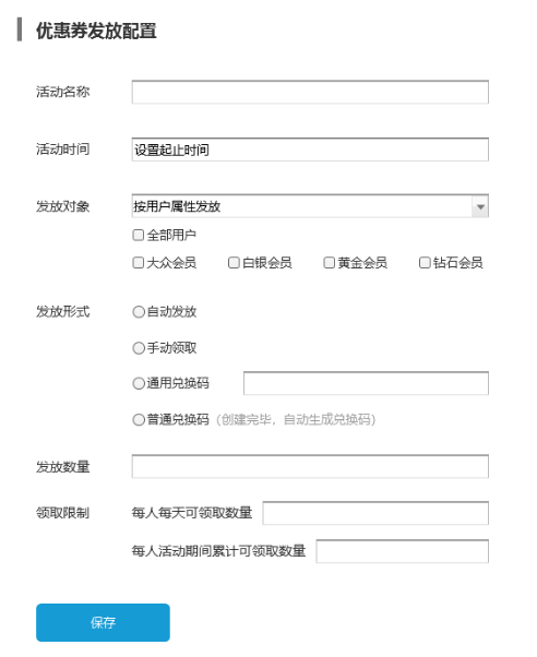 所有优惠券的发放要设置这几个条件:活动名称、发放时间、发放对象、发放形式、发放数量、领取限制。