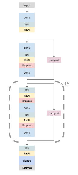 共16个resnet block,每四个resnet block增加2倍滤波器的数量,分别为32,64,128,256