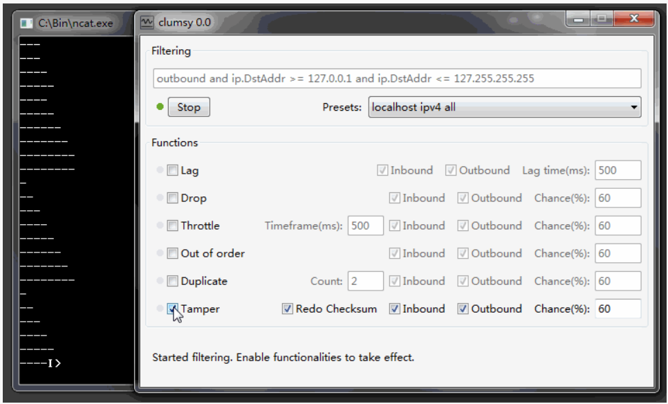 下面的动画展示了 clumsy 作用于一个本地的基于 netcat 的 UDP 服务器/客户端的情况。仔细观察你可以看到数据根据在 clumsy 的影响下产生了相应的变化。 如果你基本知道了 clumsy 是干什么用的,不妨到下载页面选择适用于你系统的版本进行下载。