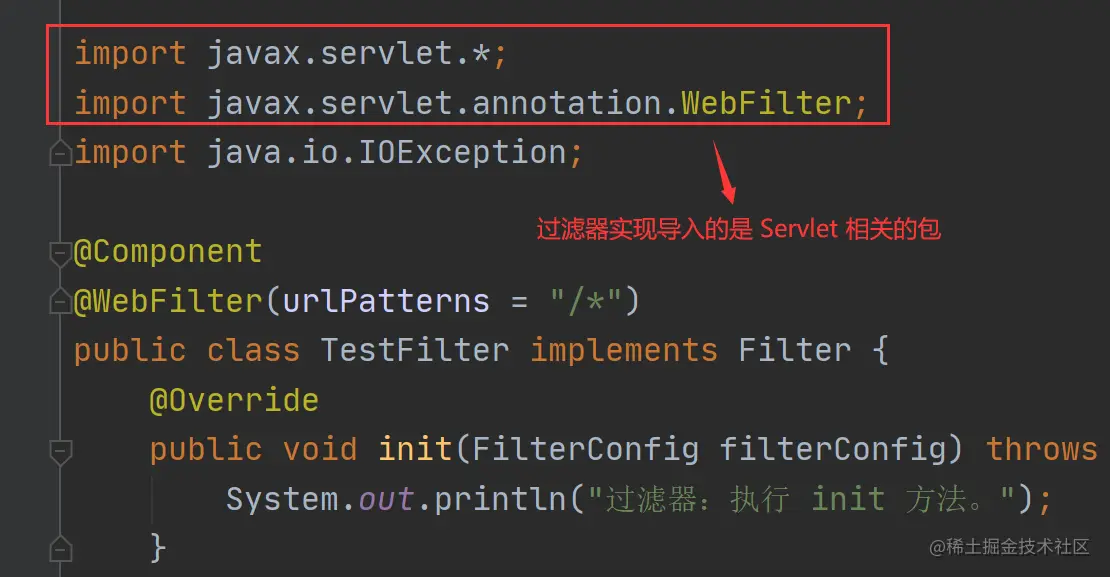 过滤器来自于 Servlet,而拦截器来自于 Spring 框架,从上面代码中我们也可以看出,过滤器在实现时导入的是 Servlet 相关的包,如下图所示: