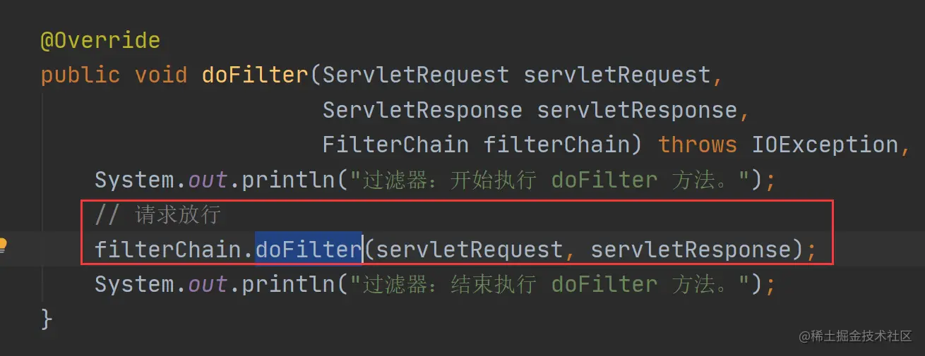 过滤器是基于方法回调实现的,我们在上面实现过滤器的时候就会发现,当我们要执行下一个过滤器或下一个流程时,需要调用 FilterChain 对象的 doFilter 方法进行回调执行,如下图所示: