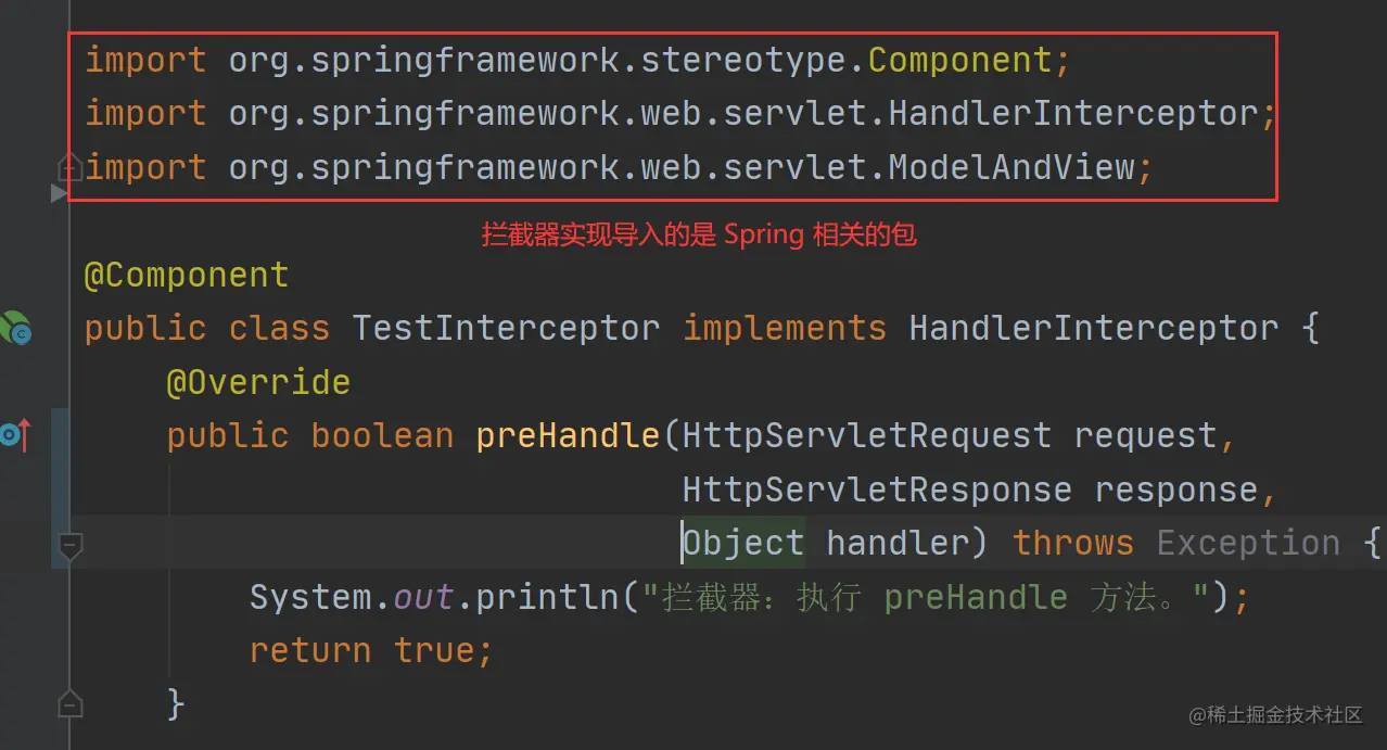 而拦截器在实现时,导入的是 Spring 相关的包,如下图所示: