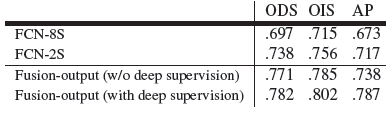 HED精度的实现主要来源于Deep supervision。如下两图展示deep supervision对精度的贡献。去掉deep supervision即图1中去掉粗线所示的训练路径。图4表格中分别列出了有无Deep supervision的精度,网络中加入Deep supervision的精度更好。图5是一个直观显示。