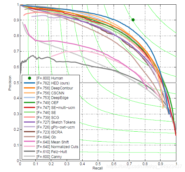 ODS:固定轮廓阈值(optimal dataset scale)选取一个固定的P(置信度),使整个数据集上F-score最大