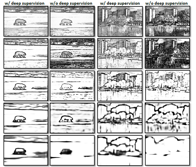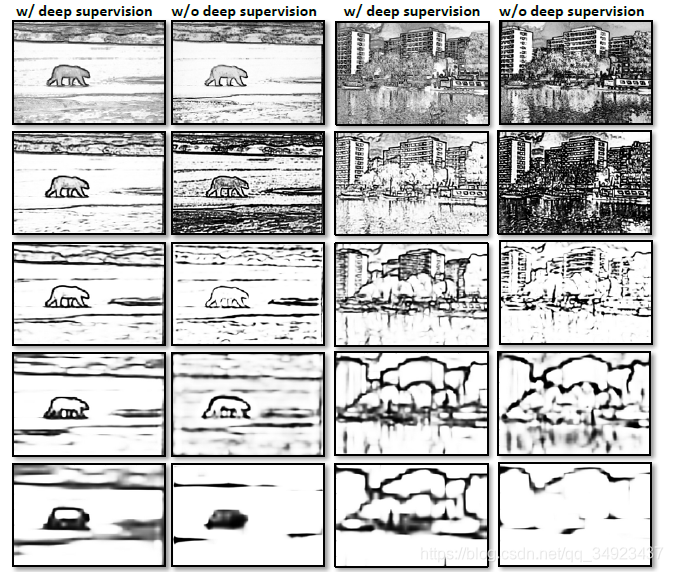 图5每行图片从上到下是网络层次从低到高hidden layer 的side output。左右两列分别是有/无deep supervision的结果。从图片可以看出,添加deep supervision后各层的输出是逐渐递进的,side output逐渐更粗化,更全局化;没有deep supervision各层的输出不是逐渐递进的,比如第二层检测出的边缘比第一层要细化,而且学习过程会丢失一部分边缘特征的信息(比如第三层开始北极熊腿部的edge的部分信息丢失)。