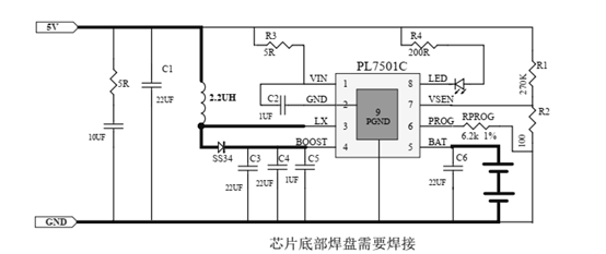 PL7501C 是一款 3.6V-5.5V 输入, 1A 输出,两节锂电池/锂离子电池充电的异步升压充电控制器。具有完善的充电保护功能。针对不同的应用场合,芯片可以通过方便地调节外部电阻的阻值来改变充电电流的大小。针对不同种类的适配器,芯片内置自适应电流调节环路,智能调节充电电流大小,从而防止充电电流过大而拉挂适配器的现象。该芯片将功率管内置从而实现较少的外围器件并节约系统成本。