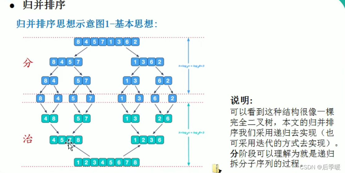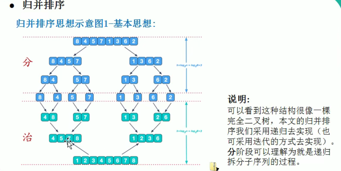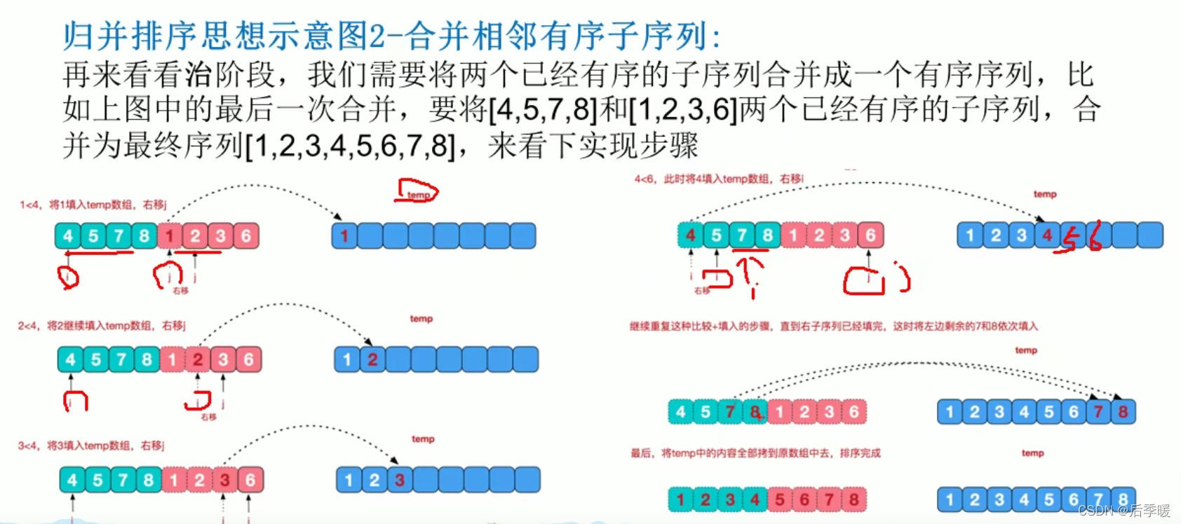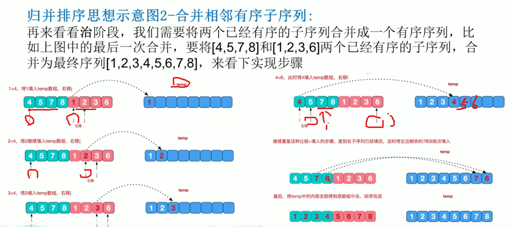 import java.util.Arrays;public class Mergesort {public static void main(String[] args) {int arr[]={8,4,5,7,1,3,6,2};int temp[]=new int[arr.length];//归并排序需要一个额外空间mergeSort(arr,0,arr.length-1,temp);System.out.println("归并排序后="+ Arrays.toString(arr));}/*要先“分”,因为后面要“并”,所以也就是分成一个一个的怎么分 ,可以从中间切,然后分成2组,这样递归,直到分成都是一个一个的为什么merge写在mergeSort里面一起递归 这个很巧妙因为mergeSort递归很明显 从他最里面那层的mergeSort开始看它的merge最里面那层 也就是“分”完了的 然后在调用merge开始并 比如本题此时是八个数 两个两个并成一组再依次往外层merge 这样递归这样就能理解了*/public static void mergeSort(int[] arr,int left,int right,int[] temp){if(left<right){int mid=(left+right)/2;mergeSort(arr,left,mid,temp);//向左递归mergeSort(arr,mid+1,right,temp);//向右递归merge(arr,left,mid,right,temp);//在mergeSort里面调用合并的方法}}/*并的思想:并就是每次把两个小组两个小组并起来,并完之后小的放前面大的放后面(最开始是肯定两个数两个数合并,因为一开始都是单个的数)那怎么达到这个效果呢? 首先你要知道一点就是,每个小组肯定是小的在前面大的在后面所以就把前面那个小组的第一个数依次和后面那个小组的数比 假如比后者小 就直接放进temp数组里然后就继续第一个小组第二个和那个数比 比他小 继续放进temp 直到有比它大的才把第二组那个数放进去再拿第二组第二个跟第一组刚刚那个数比 这样比下去...*///合并的方法public static void merge(int[] arr,int left,int mid,int right,int[] temp){int i=left;//初始化i,左边有序序列的初始索引int j=mid+1;//初始化j,右边有序序列的初始索引int t=0;//指向temp数组的当前索引while(i<=mid && j<=right){if(arr[i]<=arr[j]){//如果左边那组的当前元素小于右边,那么就将左边那个元素填充到temptemp[t]=arr[i];t+=1;i+=1;}else{temp[t]=arr[j];//反之,将右边元素填充到tempt+=1;j+=1;}//把有剩余数据的一边的数据一次全部填充到tempwhile (i<=mid){temp[t]=arr[i];t+=1;i=+1;}while (j<=right){temp[t]=arr[j];t+=1;j=+1;}//将temp数组的元素全部拷贝到arr//注意:不是每次拷贝所有 因为是一层一层的 每次并完一层就拷贝一层到arr 所以每层arr中元素顺序都不一样的 因为比过大小了t=0;int tempLeft=left;while(tempLeft<=right){arr[tempLeft]=temp[t];t+=1;tempLeft+=1;}}}}