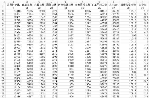 这里我们用到的数据来源于2013年《中国统计年鉴》,数据以居民的消费性支出为因变量y,其他9个变量为自变量,其中x1是居民的食品花费,x2是衣着花费,x3是居住花费,x4是医疗保健花费,x5是文教娱乐花费,x6是职工平均工资,x7是地区的人均GDP,x8是地区的消费价格指数,x9是地区的失业率。在这所有变量里面,x1至x7以及y的单位是元,x9是百分数,x8没有单位,因为其是消费价格指数。数据的总体大小为31x10,即31行、10列,大体内容如图2所示。