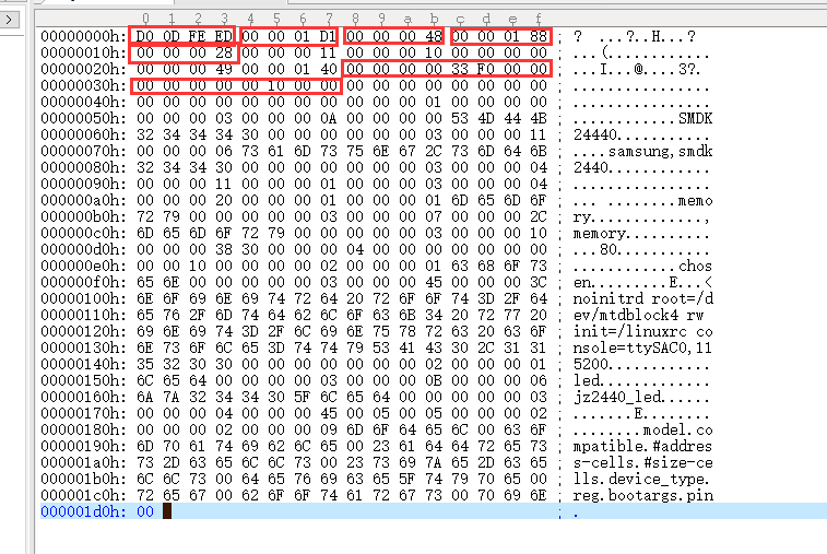 分析device-tree structure区域,是最复杂的区,用0x00000001表示根节点和子节点的开始,从0x00000002结束,整个根节点结束 0x00000009