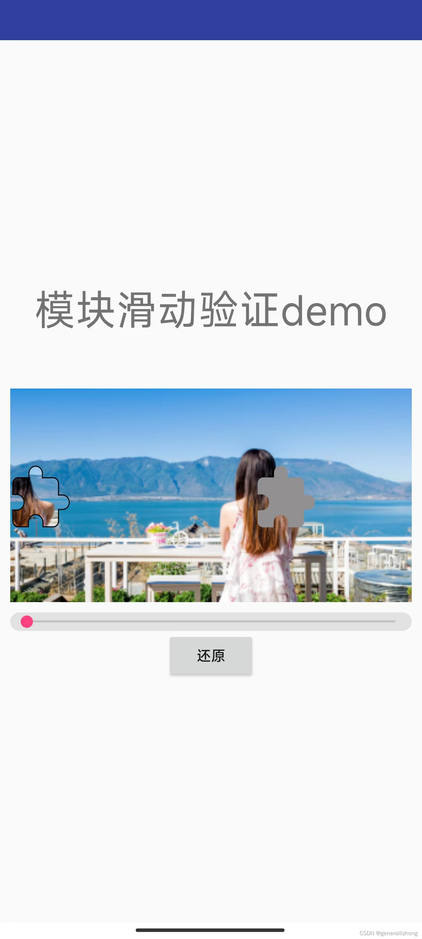 public class MainActivity extends Activity {//滑块private SeekBar mSeekBar;//自定义的控件private ImageAuthenticationView mDY;private Button btn;@Overrideprotected void onCreate(Bundle savedInstanceState) {super.onCreate(savedInstanceState);setContentView(R.layout.activity_main);initView();initListener();}private void initView() {mDY = findViewById(R.id.dy_v);mSeekBar = findViewById(R.id.sb_dy);btn = findViewById(R.id.btn);}private void initListener() {//滑块监听mSeekBar.setOnSeekBarChangeListener(new SeekBar.OnSeekBarChangeListener() {@Overridepublic void onProgressChanged(SeekBar seekBar, int i, boolean b) {//设置滑块移动距离mDY.setUnitMoveDistance(mDY.getAverageDistance(seekBar.getMax()) * i);}@Overridepublic void onStartTrackingTouch(SeekBar seekBar) {}@Overridepublic void onStopTrackingTouch(SeekBar seekBar) {//验证是否拼接成功mDY.testPuzzle();}});//控件监听mDY.setPuzzleListener(new ImageAuthenticationView.onPuzzleListener() {@Overridepublic void onSuccess() {//mSeekBar.setEnabled(false);//禁止滑动Toast.makeText(MainActivity.this, "验证成功", Toast.LENGTH_SHORT).show();}@Overridepublic void onFail() {Toast.makeText(MainActivity.this, "验证失败", Toast.LENGTH_SHORT).show();mSeekBar.setProgress(0);}});//还原btn.setOnClickListener(new View.OnClickListener() {@Overridepublic void onClick(View v) {//mSeekBar.setEnabled(true);mSeekBar.setProgress(0);mDY.reSet();}});}