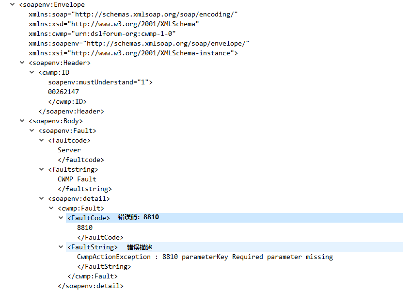 l SOAP的detail元素必须包含一个在“urn:dslforum-org:cwmp-1-0”名称空间中定义的错误结构