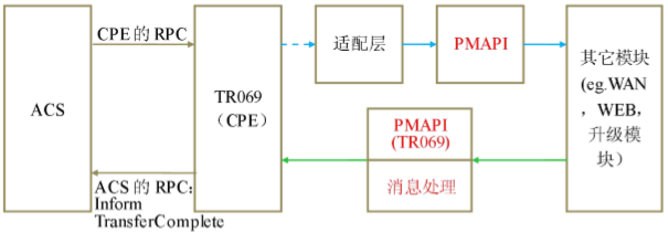 下图绿线所示,其它模块跟 TR069 交互通过调用 TR069 的 PMAPI 或者发送消息