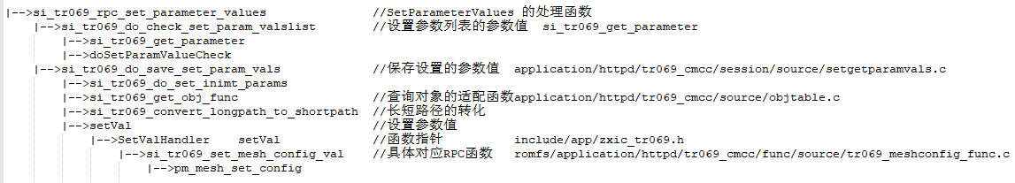获取参数调用 RPC 方法:SetParameterValues,在下行中选择SetParameterValues 的适配函数 si_tr069_set_mesh_config_val,具体函数调用流程如下图所示。