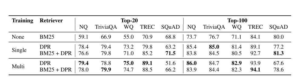 虽然让检索器适应每个数据集是很好的,但也希望获得一个在所有情况下都能很好工作的检索器。为此,作者通过组合来自所有数据集(不包括SQuAD v1.1)的训练数据来训练多数据集encoder。除了DPR还展示了BM25(参数b = 0.4和k1= 0.9)、BM25+DPR的结果,使用它们的分数的线性组合作为新的排序函数。具体来说,分别获得基于BM25和DPR检索的前2000篇文章,并使用BM25 ( ( ( q q q , , , p p p ) ) ) + λ λ λ sim ( ( ( q q q , , , p p p)作为排序函数对它们的并集进行了rerank。其中λ = 1.1。Multi表示数据集融合后的结果