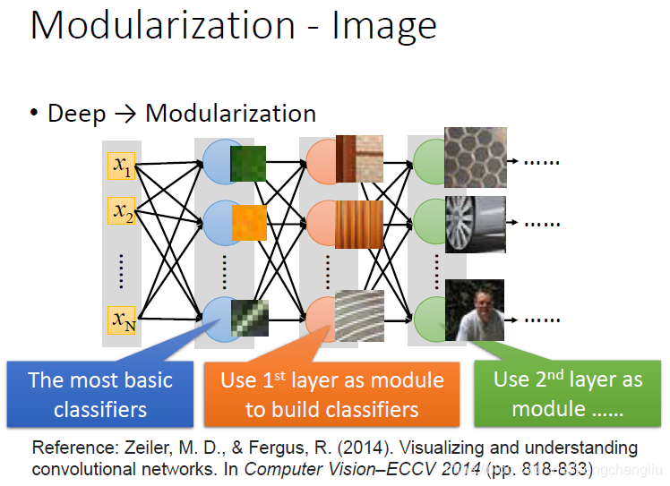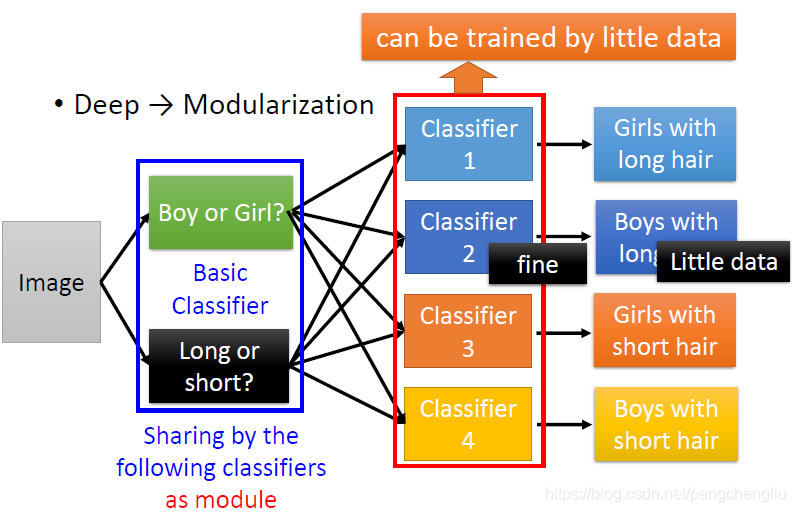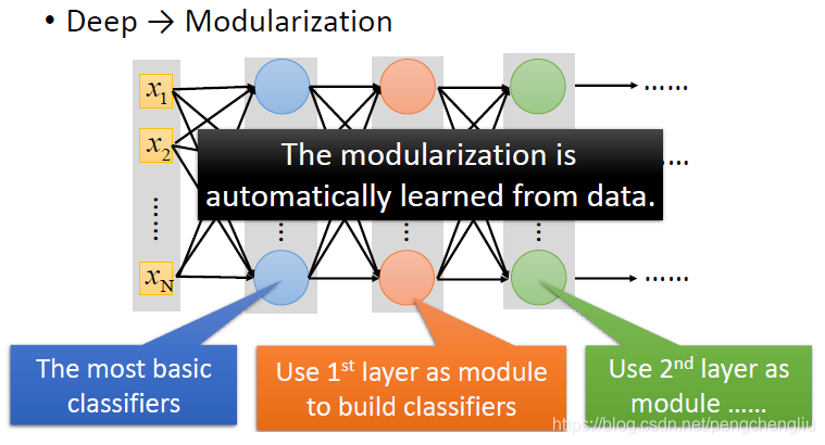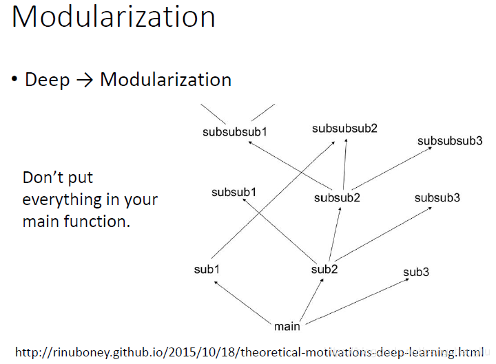 ---------------------------------------------------------------------------------------------------------------------------- 为什么会这样呢? 我们可以想象说,当我们在做deep learning的时候,其实我们是在做模块化这件事情。什么意思呢,大家应该都会写程序,写程序的时候不能把所有的代码都写在一个函数里面,而是写一些子函数。然后层层调用。这样做的好处是,有的函数可以共用,不用每次都写,进而减小程序的复杂度。