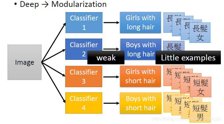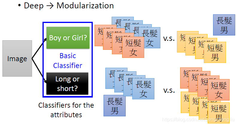 那怎么办呢?你可以用模块化的思想。 假设我们现在不是直接去解那个问题,而是把原来的问题切成比较小的问题,比如我们去learn一些分类器,这个分类器的工作呢,是去detect 有没有一种attribute(属性)出现。比如这里不是这里不是直接detect长发男生还是长发女生,而是把这个问题切成比较小的问题。切成两个问题,输入一张图片判断是长头发还是短头发,输入一张图片判断是男生还是女生。虽然说长头发的男生数量很少,但是男生女生的data可以收集很多。同样长头发和短头发的data也可以收集很多。所以,在train这个basic 分类器的时候,就不会说train的太差。这个分类器都有足够的data。