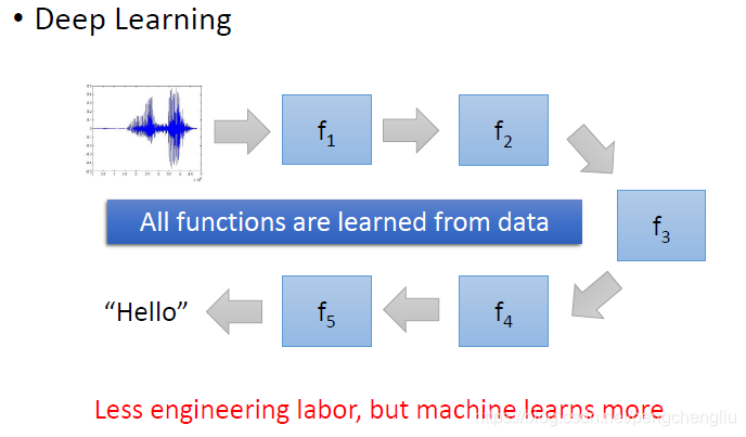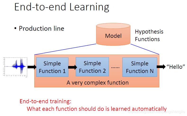 ---------------------------------------------------------------------------------------------------------------------------- 当我们用deep learning的时候呢,另外一个好处是,我们可以做end-to-end learning.所谓的end-to-end learning,意思是这样。 比如说我们要处理的问题呢,非常复杂。比如语音识别。我们要解一个machine learning的问题,我们首先要找一个Model。当你要处理的问题很复杂的时候,你的model它会需要是一个生产线。这个model表示一个很复杂的function,是由很多个比较简单的function串叠在一起。比如说要做声音识别,先把声音信号送进来,然后通过很多个function一层一层的转换,最后变成文字。当做end-to-end learning的时候,就是说,只给你的model input和output,不告诉它说中间每一个function要怎么分工,让它自己去学每一个点要做什么事情。在deep learning里,要做这件事情的时候,就是叠一个很深的神经网络,每一层就是生产线上的一个点,就是一个简单的函数,每一层就会自己学到应该做什么事情。